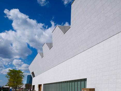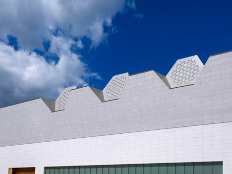 Maki a imaginatcladireacaocompozitie geometrica pentru o serie desuprafete albe, care se indoaie ca niste coli de harrie pliata in jurul unei curti scaldate in lumina soarelui. Peretii exteriori placati cu granit alb de Brazilia sunt inclinati, pentru ca au fost special conceputi sa capteze permanent lumina soarelui, in functie de miscarea lui pe bolta. Astfel, se sporeste luminozitatea materialului, dar in cealasi timp se creeaza pe granitul imaculat si niste jocuri de lumini si umbre, care pun in valoare suprafetele de piatra naturala.