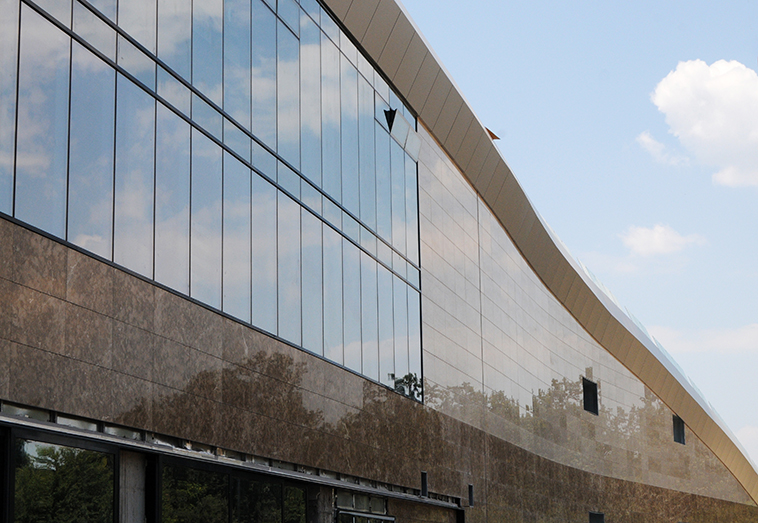 O cladire futurista, cu fatada de marmura, pe montare uscata