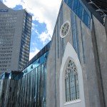 Speciale la aceasta fatada sunt benzile de piatra naturala care au fost montate orizontal pentru a alcatui dungi verticale, extinzandu-se optic pana la acoperisul de sticla. Sa fie prelungite pana peste inaltimea de 2,7 m a reprezentat o provocare pentru arhitect. Turnul catedralei este si el remarcabil, datorita faptului ca, desi initial era situat chiar pe mijlocul acoperisului, acum a fost mutat intr-o parte si imbracat intr-un amalgam de zinc, titan si staniu, devenind o adevarata clopotnita.