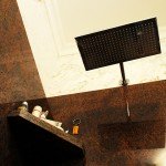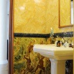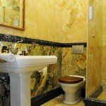 Baia de la parter este micuta si deserveste livingul, de aceea reprezinta nu doar un spatiu utilitar necesar intr-o casa mare, cu trafic dinamic ci, de asemenea, este o carte de vizita pentru oaspeti, care au acces direct la ea. Onixul domina cu transparenta si straturile sale inconfundabile amenajarea, creand o atmosfera blanda, dar luxoasa, in gaben si verde, pusa in valoare de lumina calda a becurilor. S-au folosit ca materiale Onix Mielle pentru podeste, dar si pentru zonele verticale care merg spre tavan. Dinamismul aranajamentului si efectele cu adevarat interesante sunt date de Onix Verde ce creeaza un brau vertical, intre toaleta si chiuveta imaculata. Pentru a separa vizual cele doua tipuri de onix, s-a creat o recompunere de lastre cu ajutorul unei borduri din marmura Nero Levadia masiva.