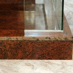 Baia ce deserveste biroul, adica spatiul de lucru al proprietarului, mizeaza pe un tip de marmura alba cu venaturi inchise la culoare, ceea ce determina un efect intens si remarcabil. Marmura alba Alexander cu recompunere de lastre este completata vizual de granitul Rosu Multicolor, de 2 cm grosime, tot cu recompunere de lastre. Cabina de dus din granit focalizeaza atentia, datorita coloritului rosu-grena, dar si datorita structurii interesante si a instalatiilor perfect alese. In lucrare se remarca perfectiunea finisajelor si atentia la detalii, inclusiv in montarea scurgerii si a raftului dublu de granit, din interiorul dusului. Cabina de dus, din sticla transparenta, pune in valoare coloritul granitului dinamic, in contextul marmurei elegante.
