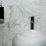 Nuanta perfecta a marmurei este greu de surprins in fotografii, data fiind transparenta ei delicata, cu toate aceastea in aceste imagini a fost bine surprins coloritul aparte al marmurei Misty White, care a fost folosita pentru podeste si pereti verticali: nuante delicate de verde se pierd in albul translucid, alcatuind venaturi usor de distins.